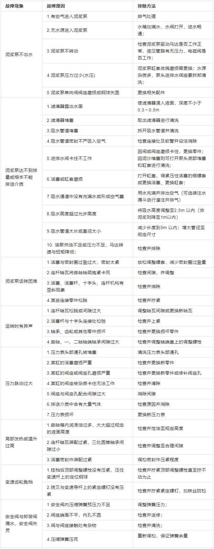 表8 泥浆泵部分常见故障处理表