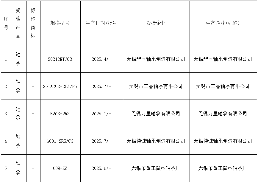2025年惠山区轴承产品质量监督抽查合格产品:
